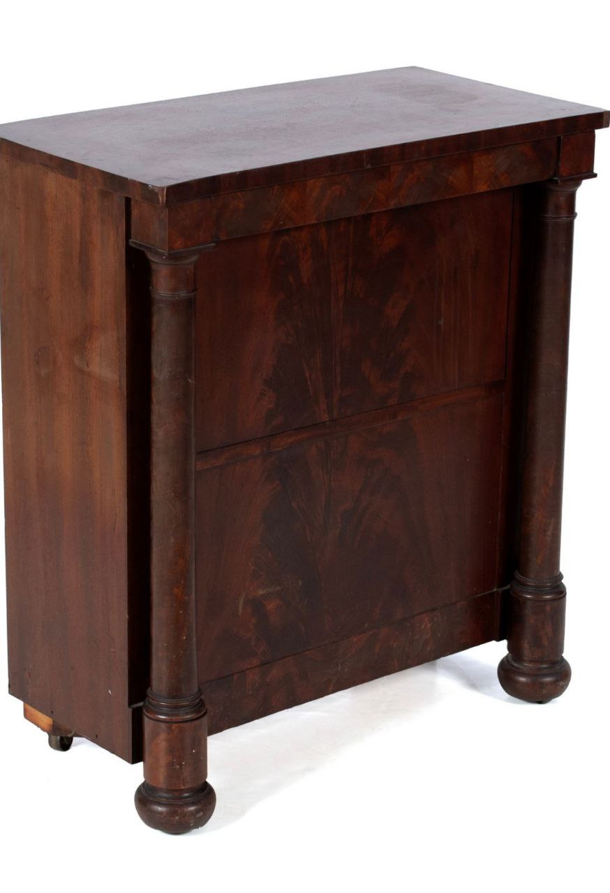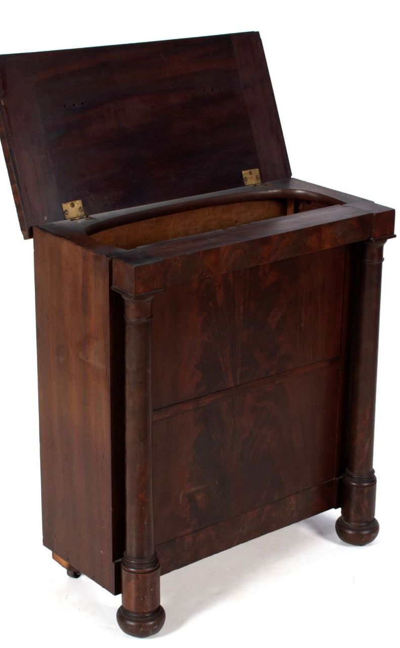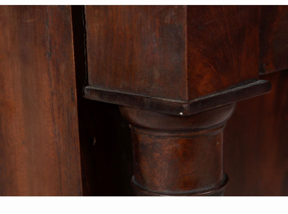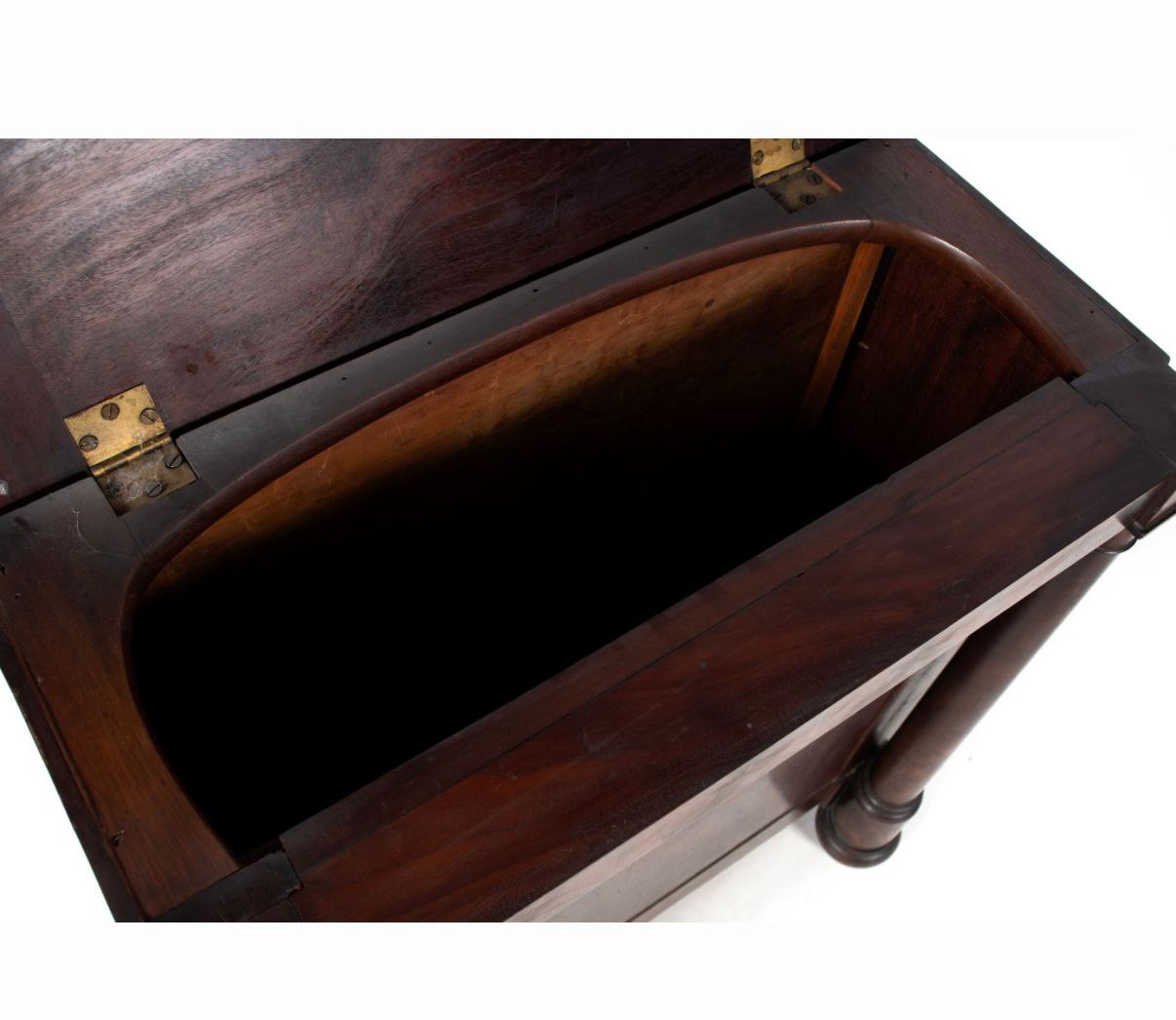 The top hinged lid opens to an interior empty well, front does not open but is flanked by two tapered free standing richly veneered mahogany columns all on classical turned bun feet. Original caster inset wheels. All original condition most likely Boston or NY makers.