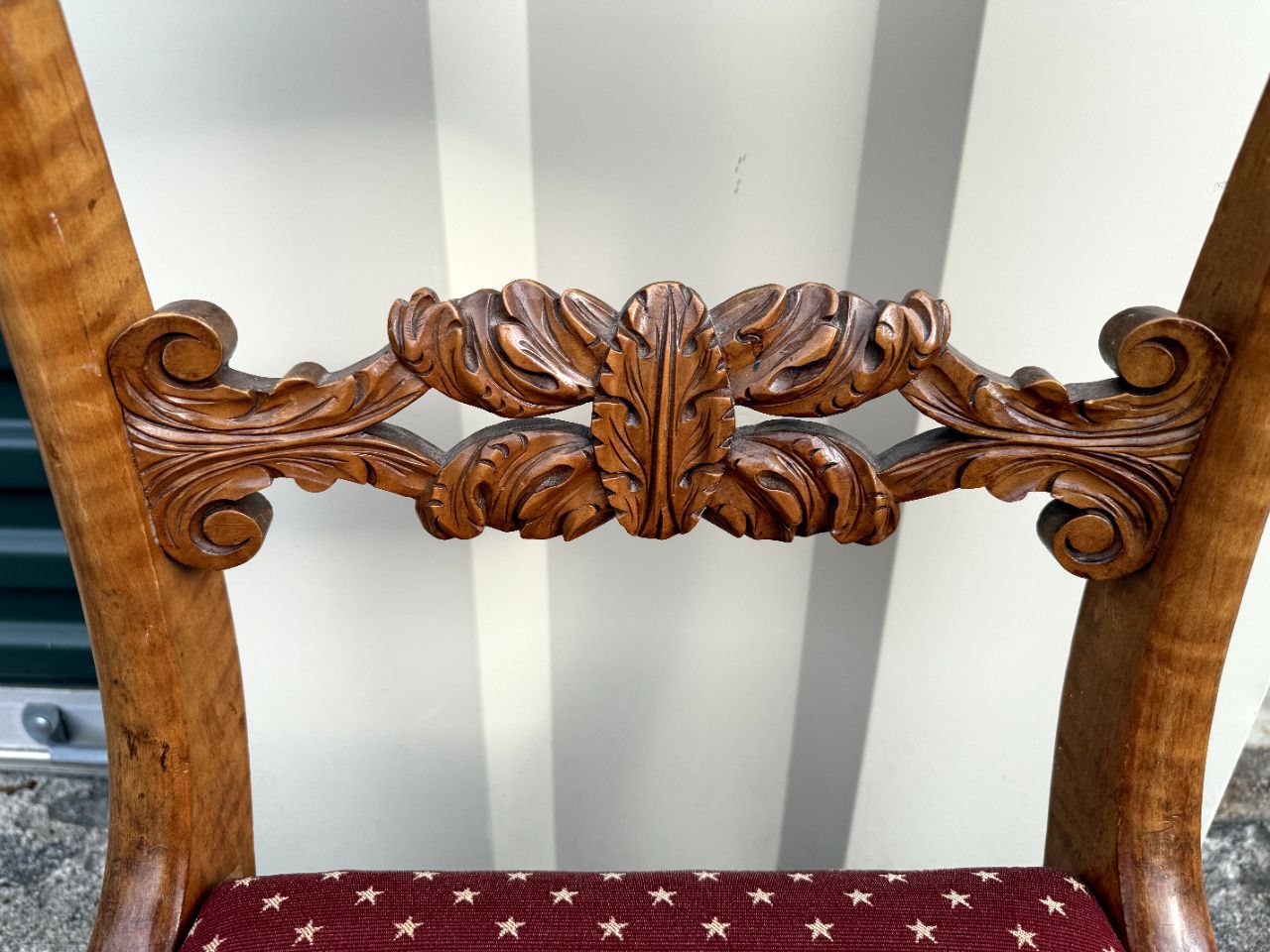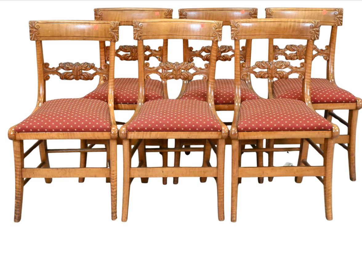 A fine and rare set of six tiger maple chairs. These fine examples each have rich Tiger maple striped carved top crest panels with floral motif above a central carved classical medallion back splat. Grecian clismos design circa 1820. – 1825 New York origin with a maker possibly by the famous Duncan Phyfe known to have used Tiger maple on various pieces.